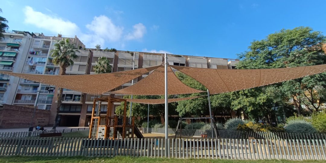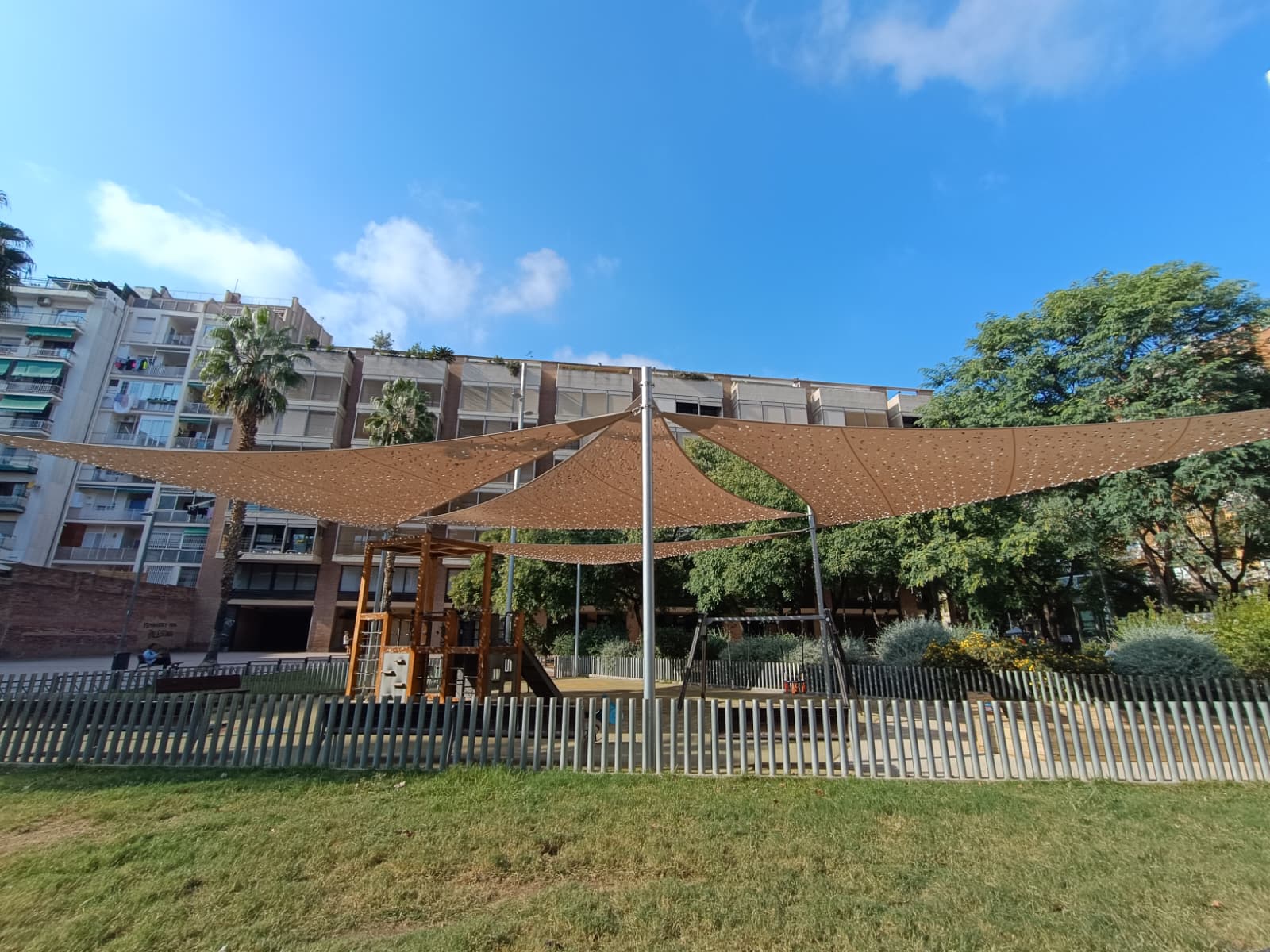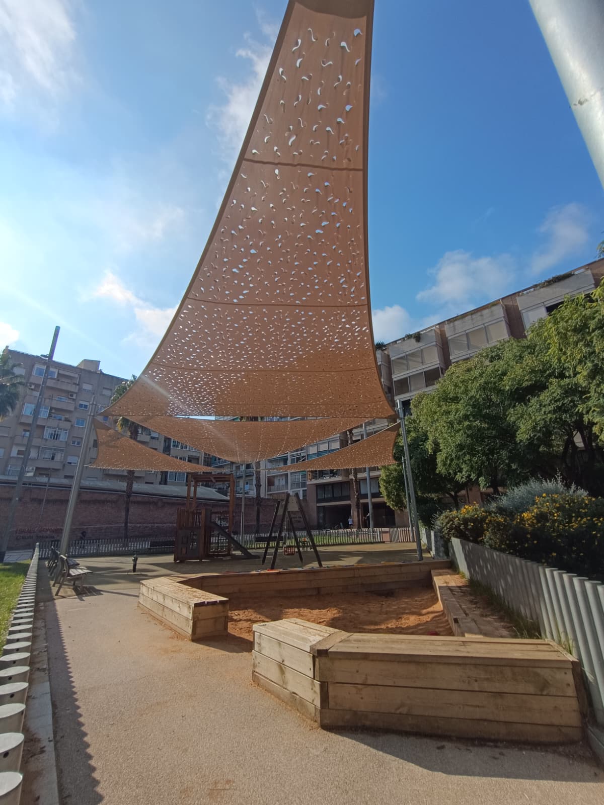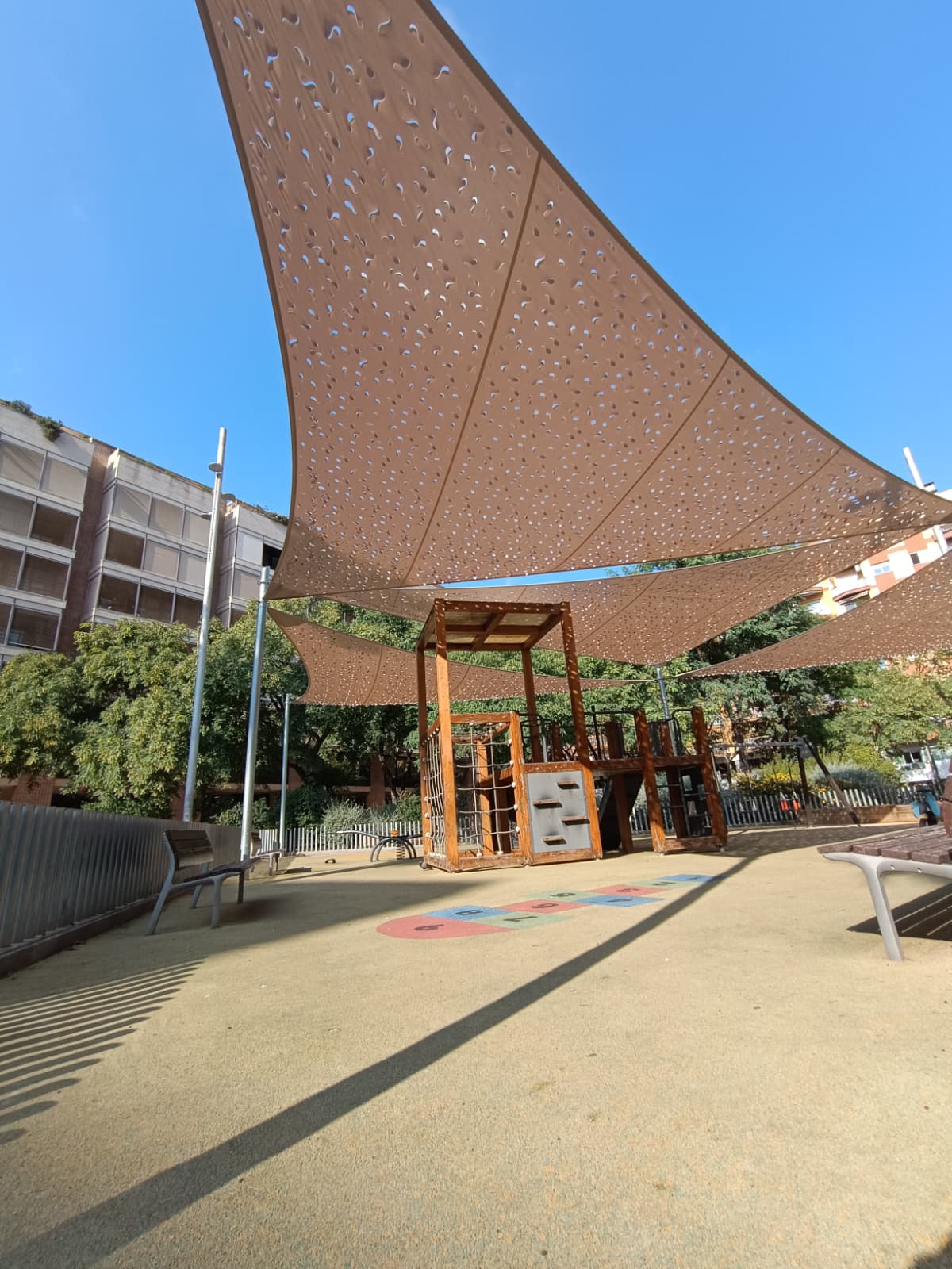 Data octubre de 2025Sobre la zona de jocs infantils del Jardins d’Antoni Puigvert s’han instal·lat tendals troquelats fabricats amb tela perforada Tecnicamo, que ofereixen una protecció fiable contra el sol durant els dies calorosos, tenint cura tant dels més petits com dels seus acompanyants.