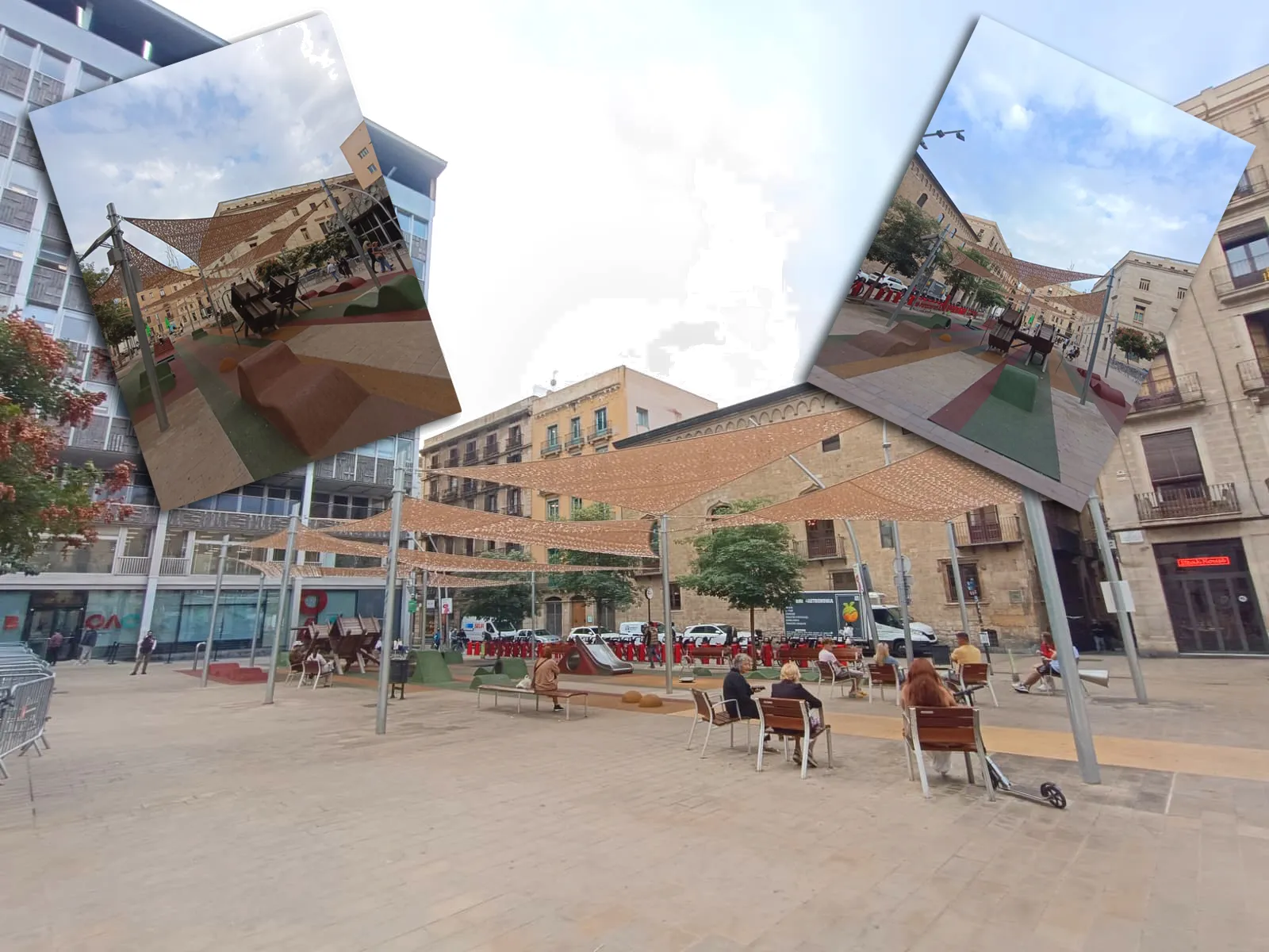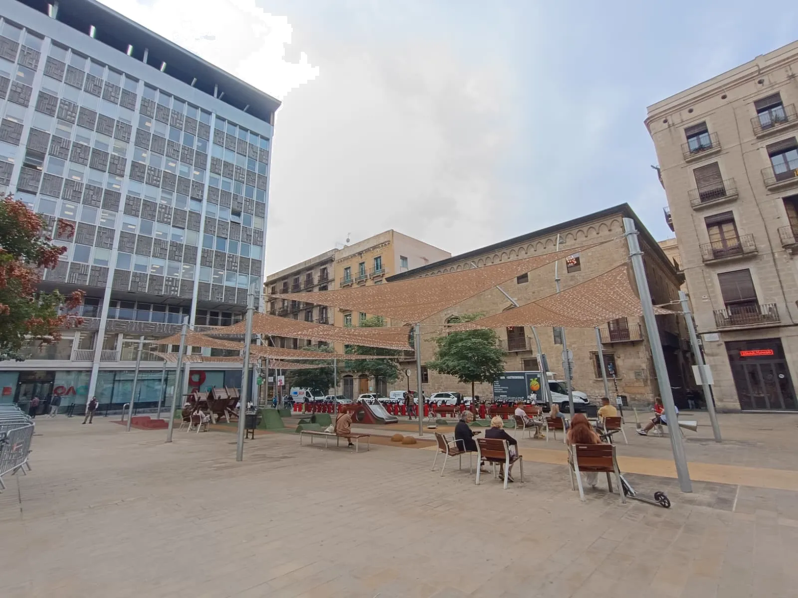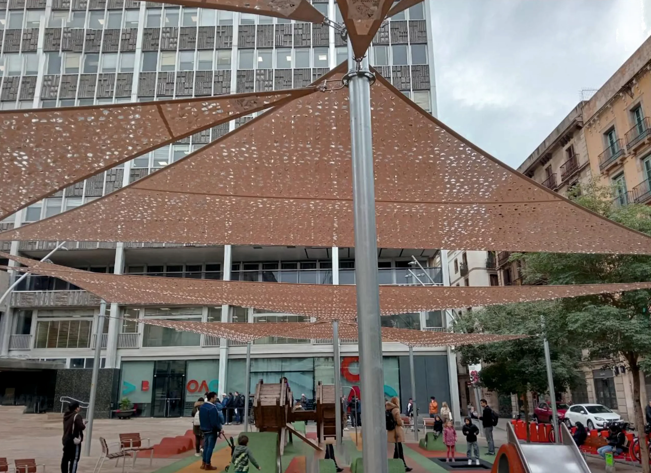 A la zona de vianants del centre històric de Barcelona s’ha instal·lat un sistema de tendals d’ombra multisecció per a la zona de jocs infantils i àrea de descans.