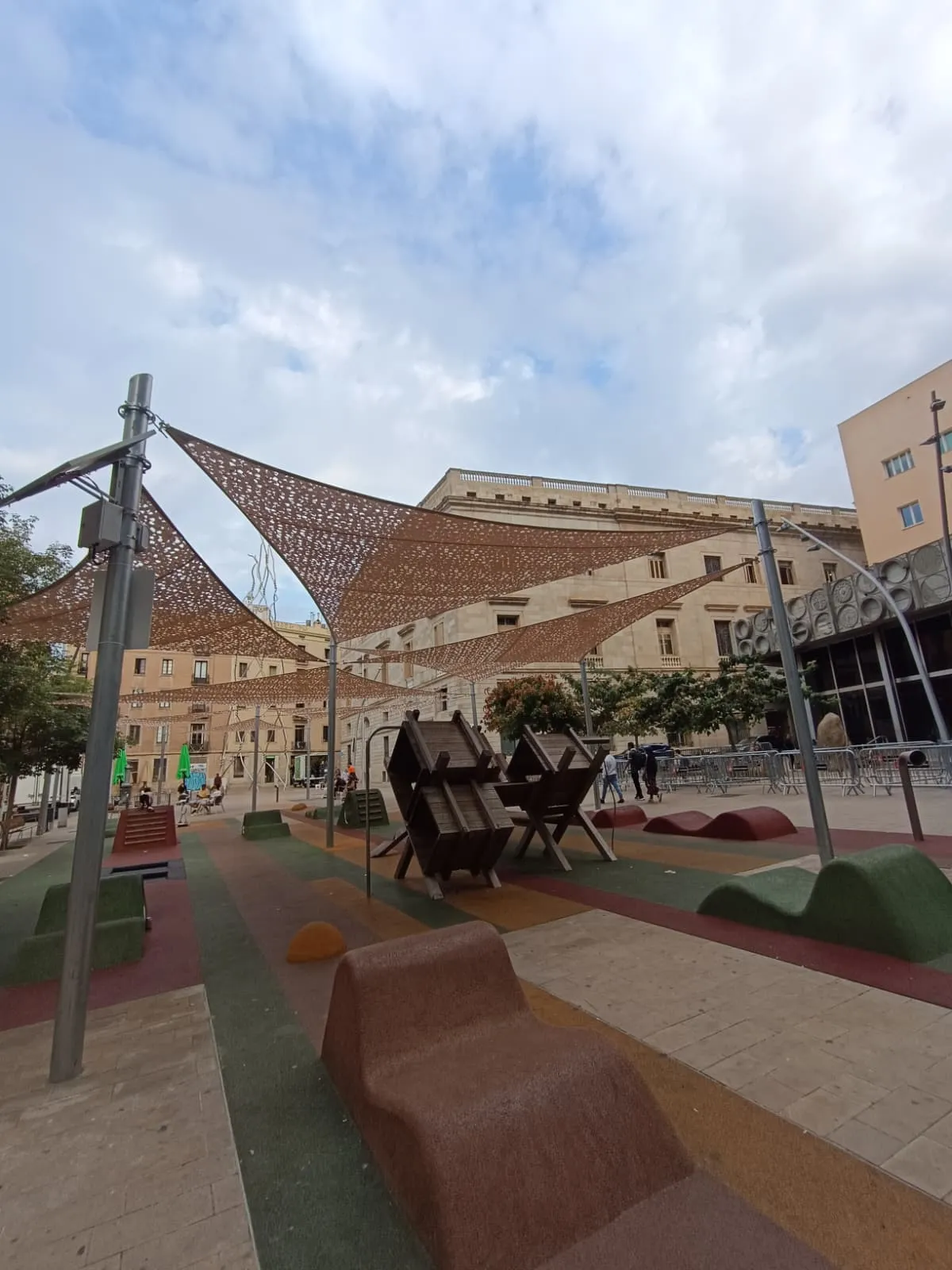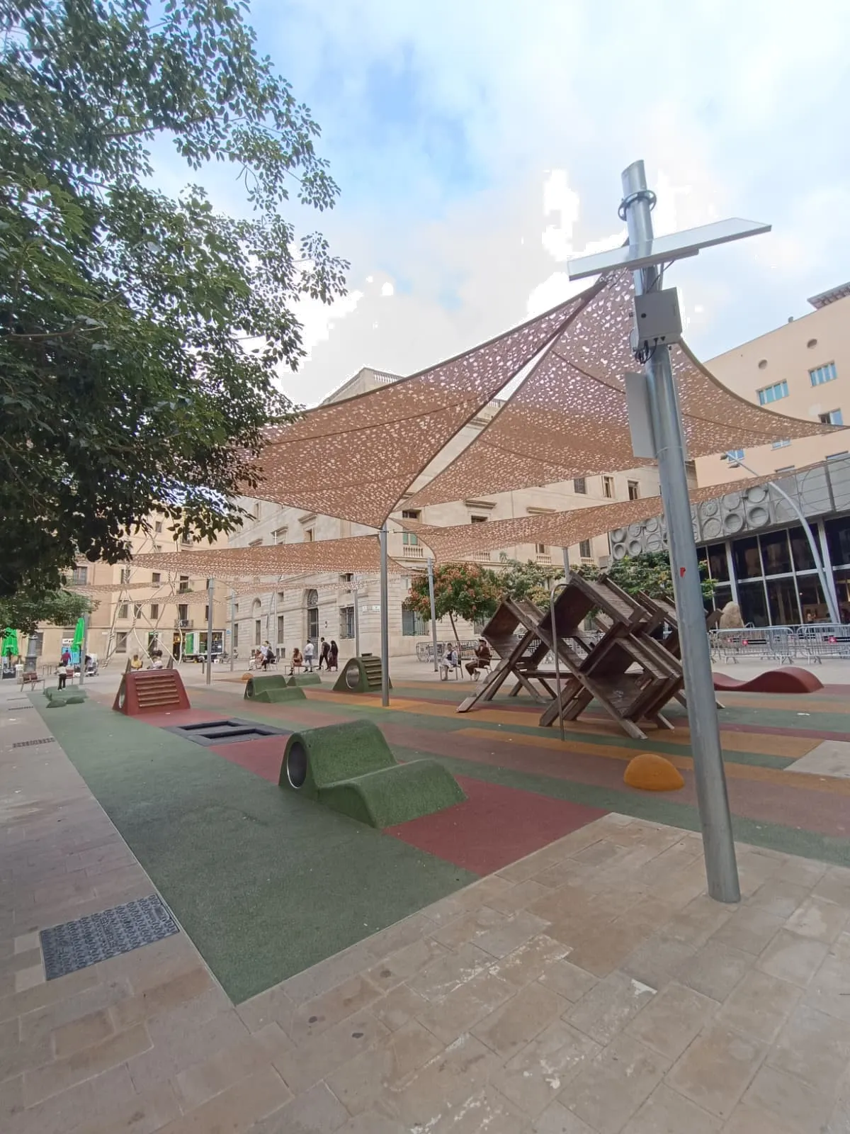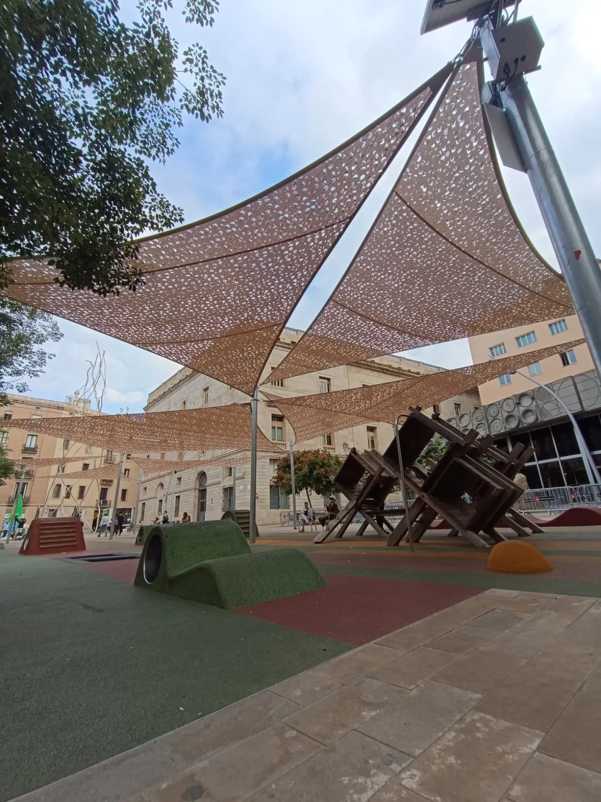 El projecte s’ha desenvolupat respectant l’entorn arquitectònic del Barri Gòtic i l’alta afluència de persones a la plaça. L’estructura, sostinguda per pilars metàl·lics independents, genera una àmplia superfície d’ombra que millora el confort tèrmic d’infants i acompanyants durant els mesos més calorosos.