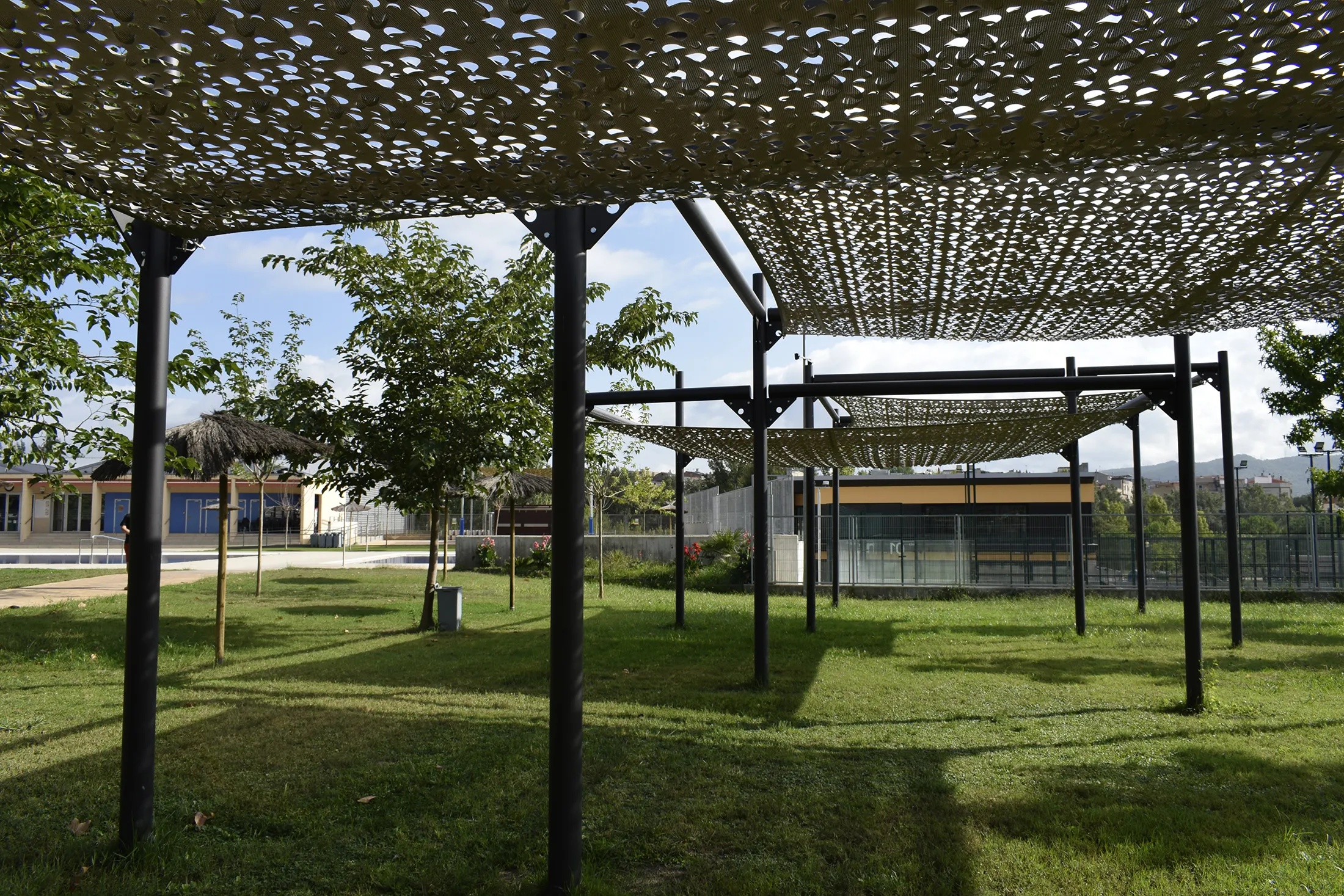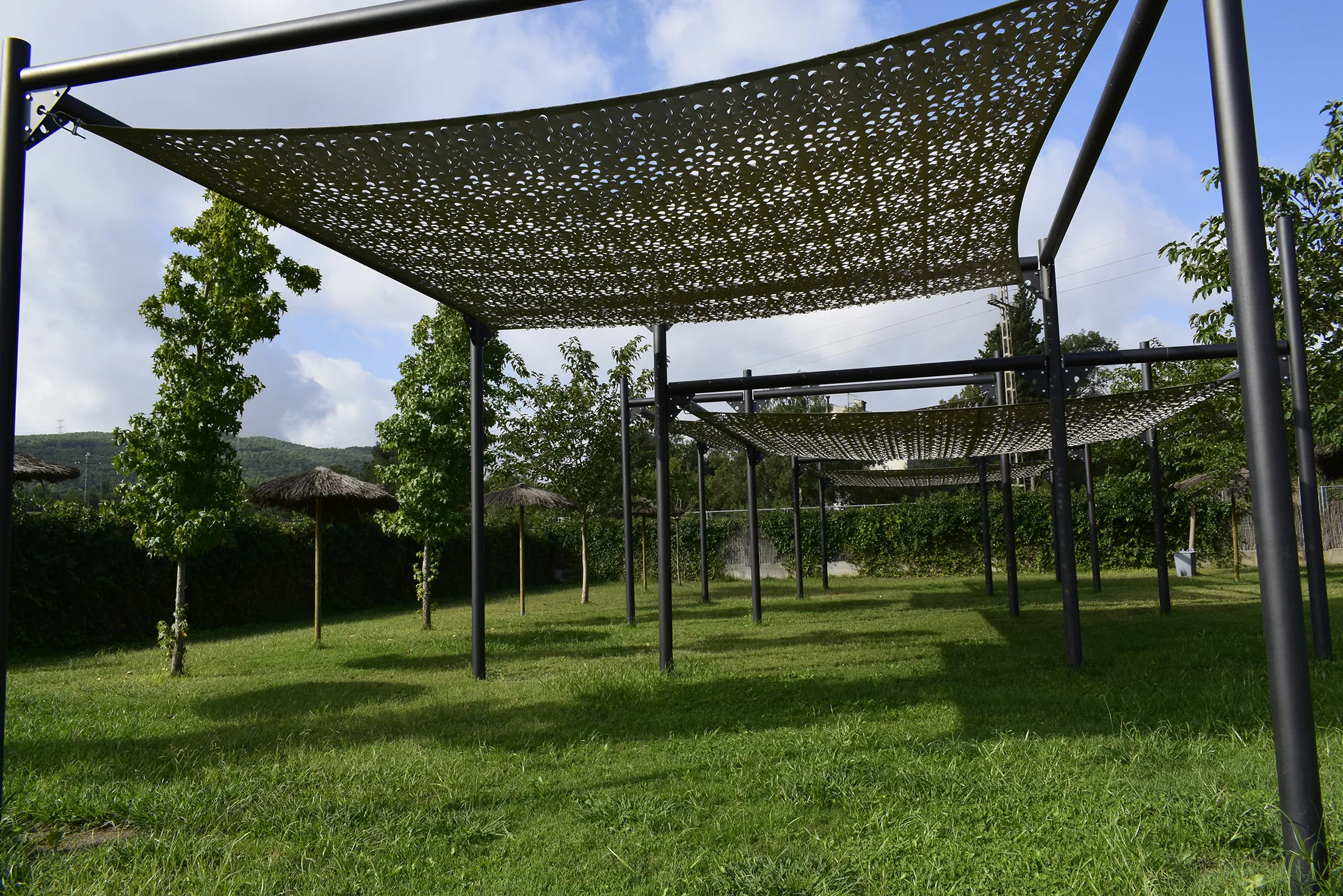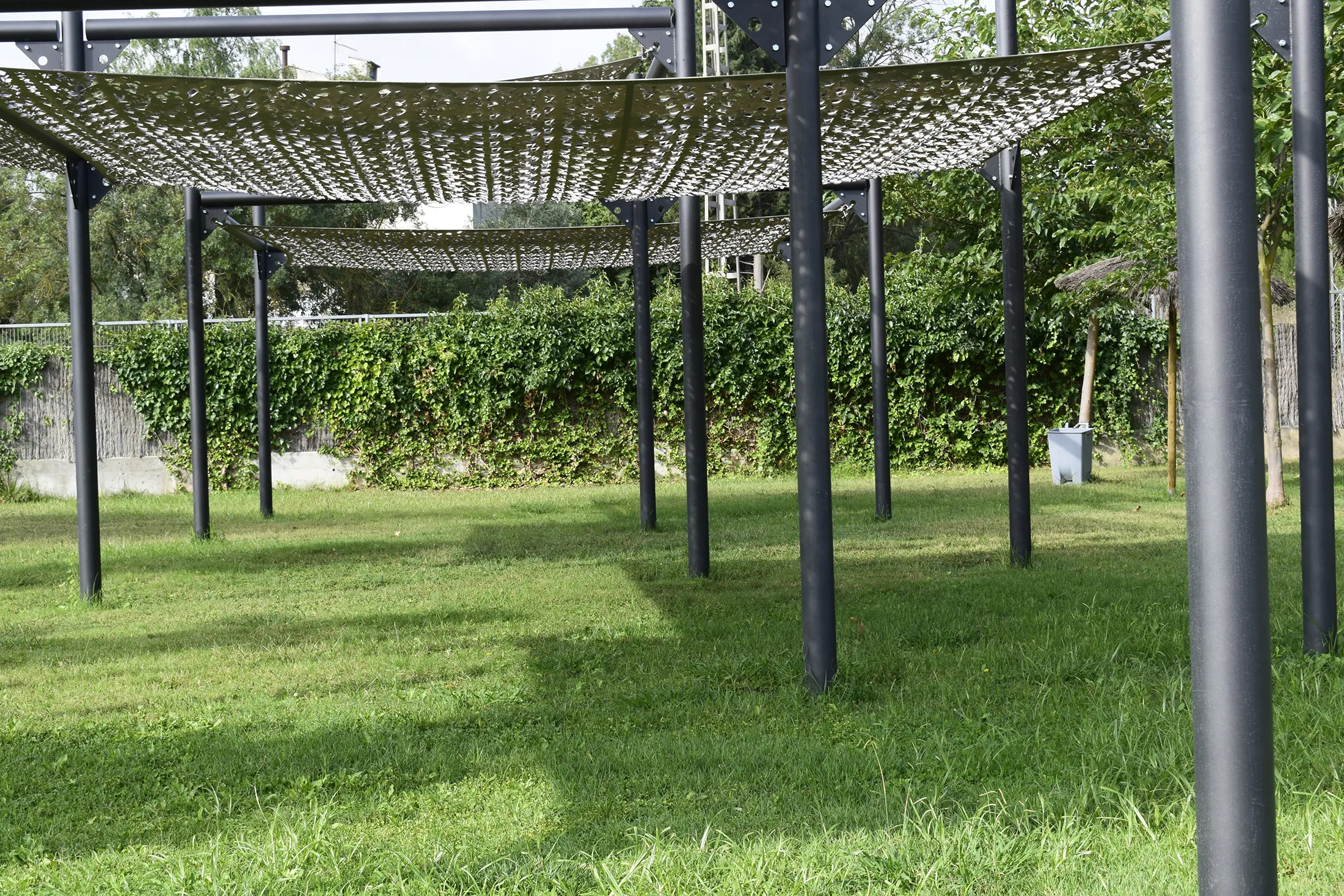 L’estructura metàl·lica garanteix durabilitat i estabilitat, mentre que la tela Tecnicamo, disposada en diferents nivells, proporciona una protecció eficaç contra el sol i genera zones d’ombra agradables a l’àrea de descans.