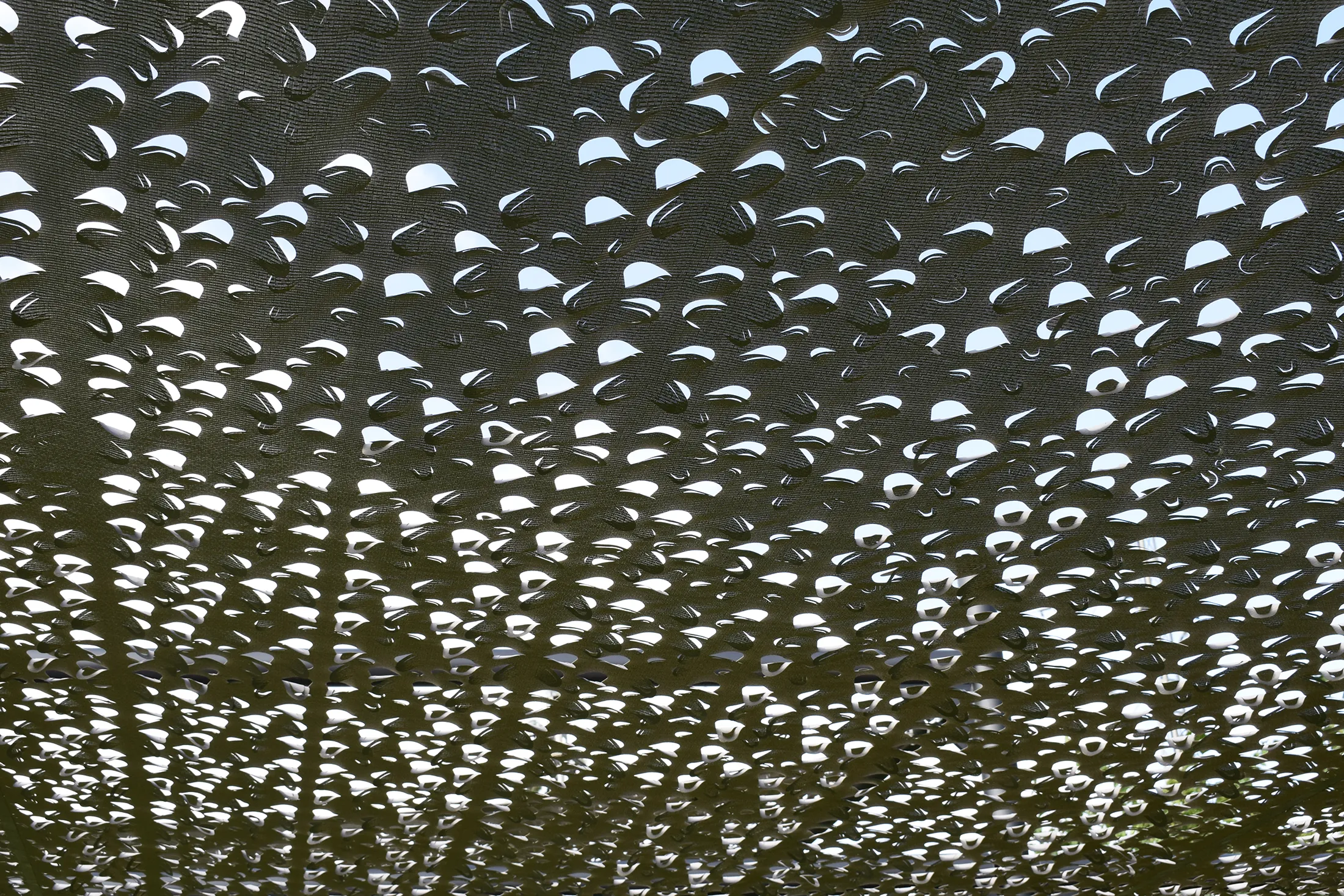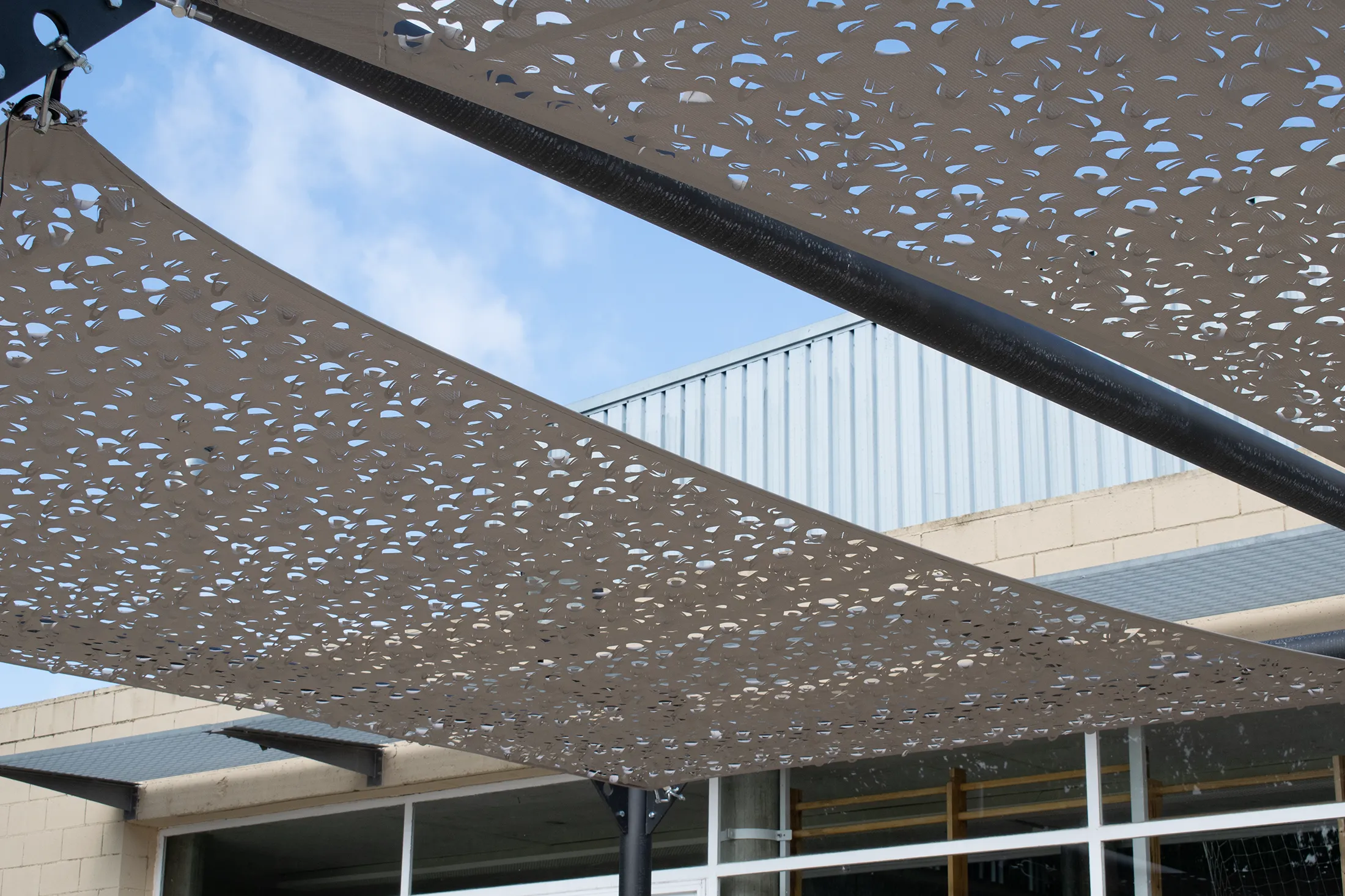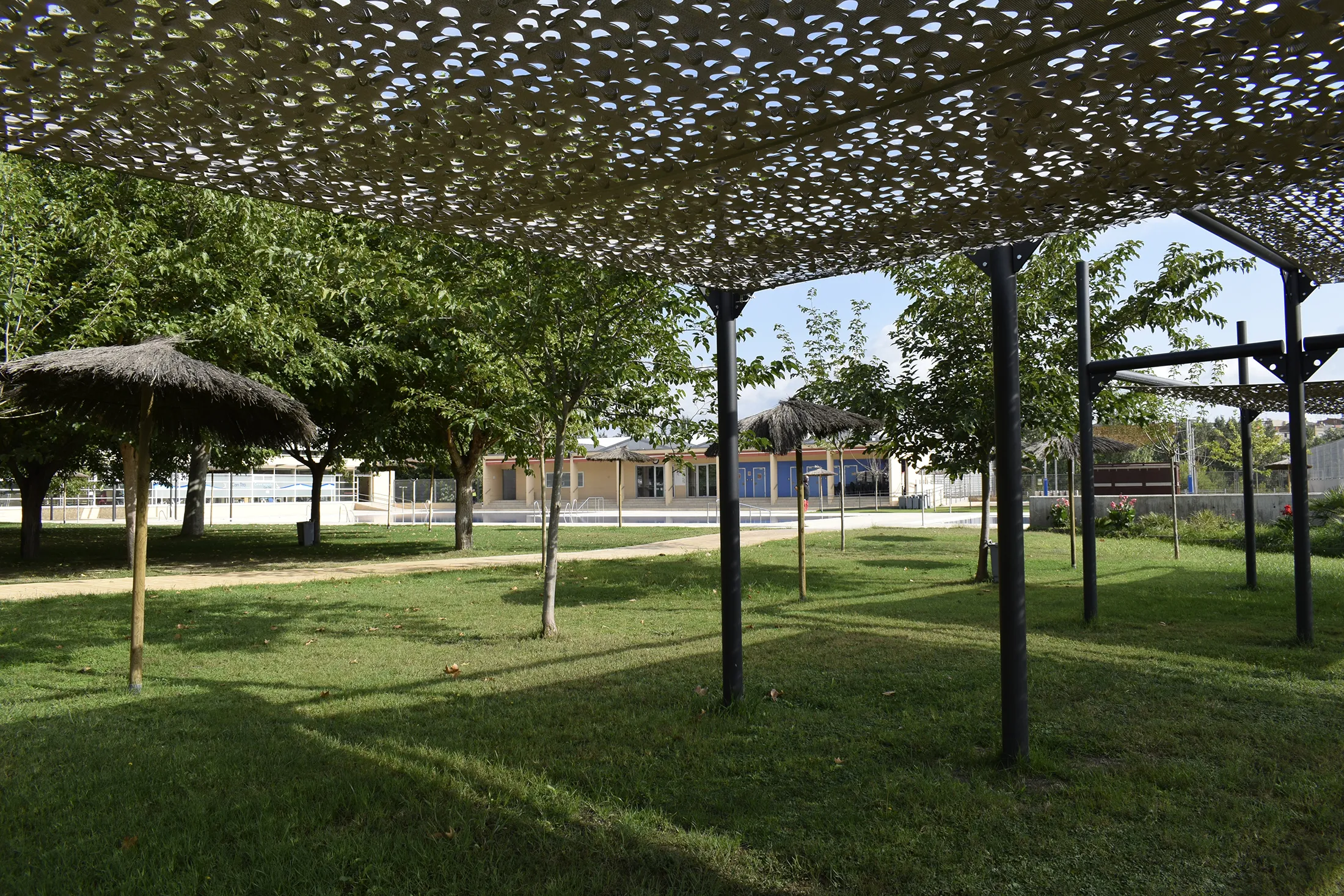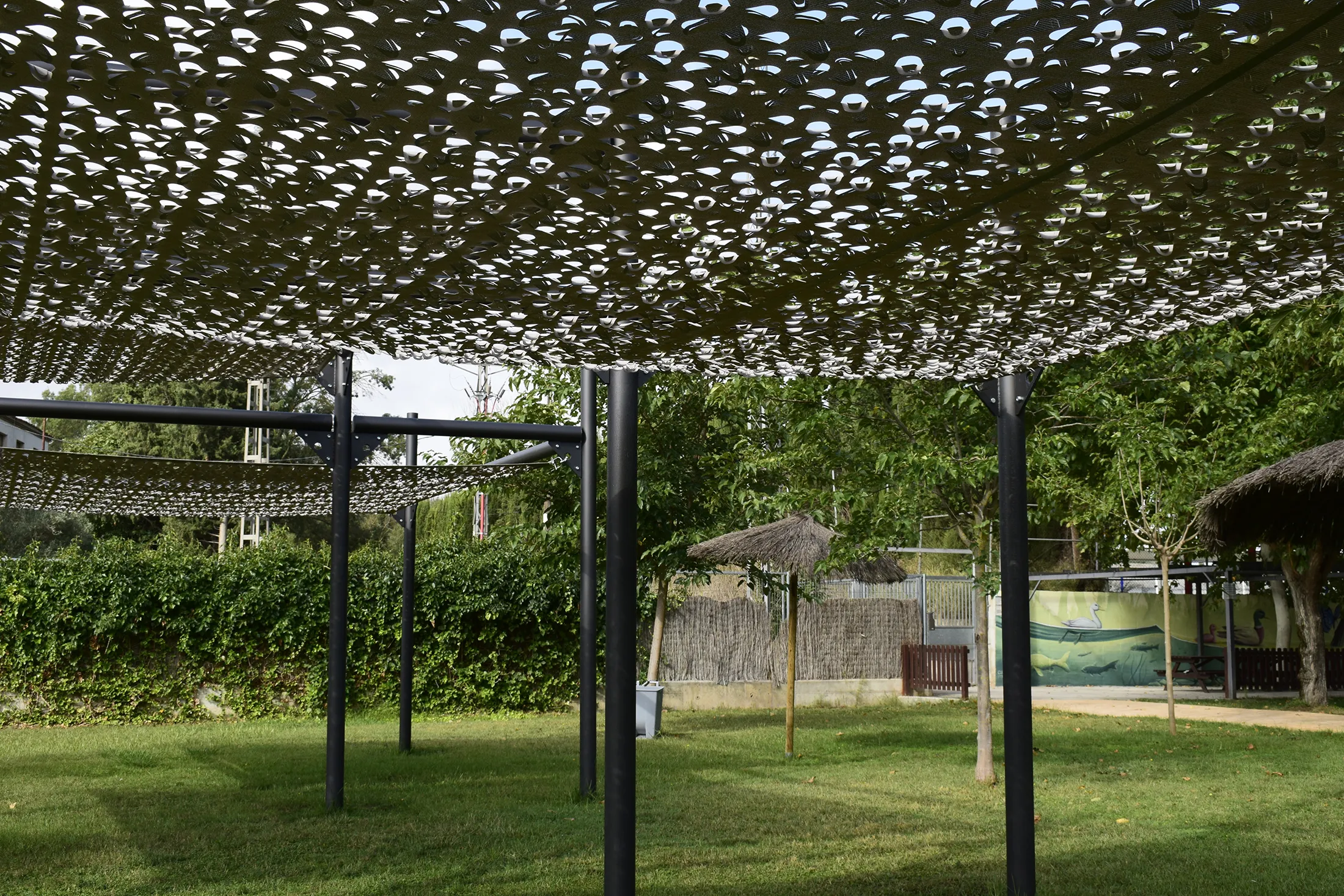 L’estructura metàl·lica garanteix durabilitat i estabilitat, mentre que la tela Tecnicamo, disposada en diferents nivells, proporciona una protecció eficaç contra el sol i genera zones d’ombra agradables a l’àrea de descans.